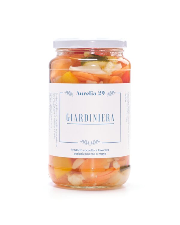 La giardiniera Aurelia29 brilla dei colori del nostro orto. Tutti gli ortaggi inclusi nella giardiniera sono raccolti, a mano, nel periodo migliore, e immediatamente trasferiti nel nostro laboratorio per essere lavorati artigianalmente. Vengono accuratamente lavati, tagliati e invasettati. Ogni operazione viene effettuata a mano.